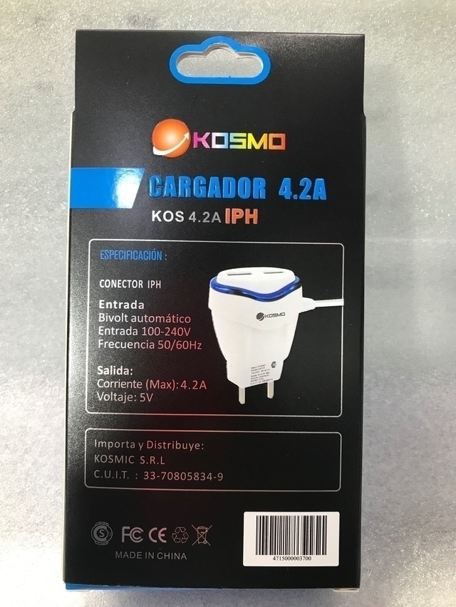 Cargador kosmo 4.2A iphone CON 2 ENTRADAS USB